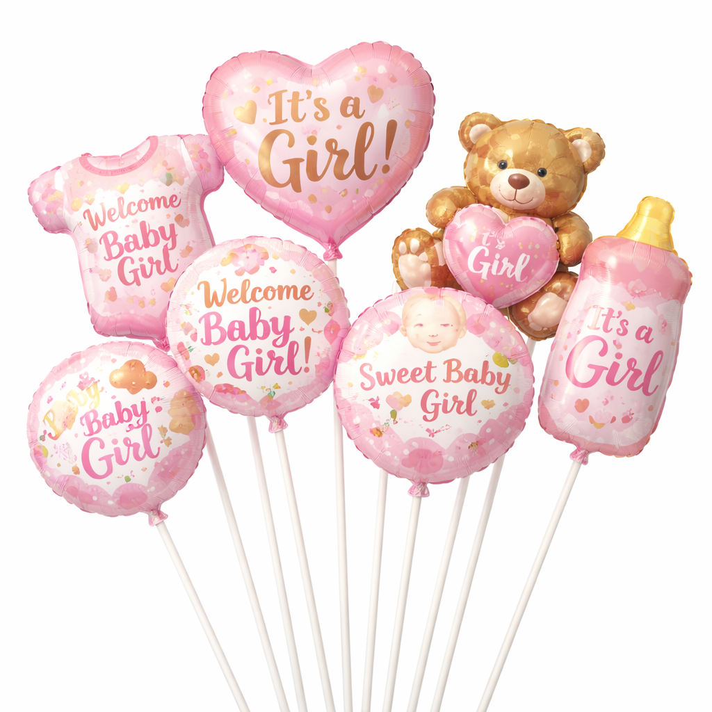 Διακοσμητικά μπαλόνια γέννησης κοριτσιού σε στικ, ιδανικά για δώρα μαιευτηρίου, ανθοδέσμες και διακόσμηση καλωσορίσματος νεογέννητου. Περιλαμβάνουν ροζ σχέδια με ευχές όπως It’s a Girl και Welcome Baby Girl, ενώ η επιλογή σχεδίου γίνεται τυχαία ανά αποστολή.