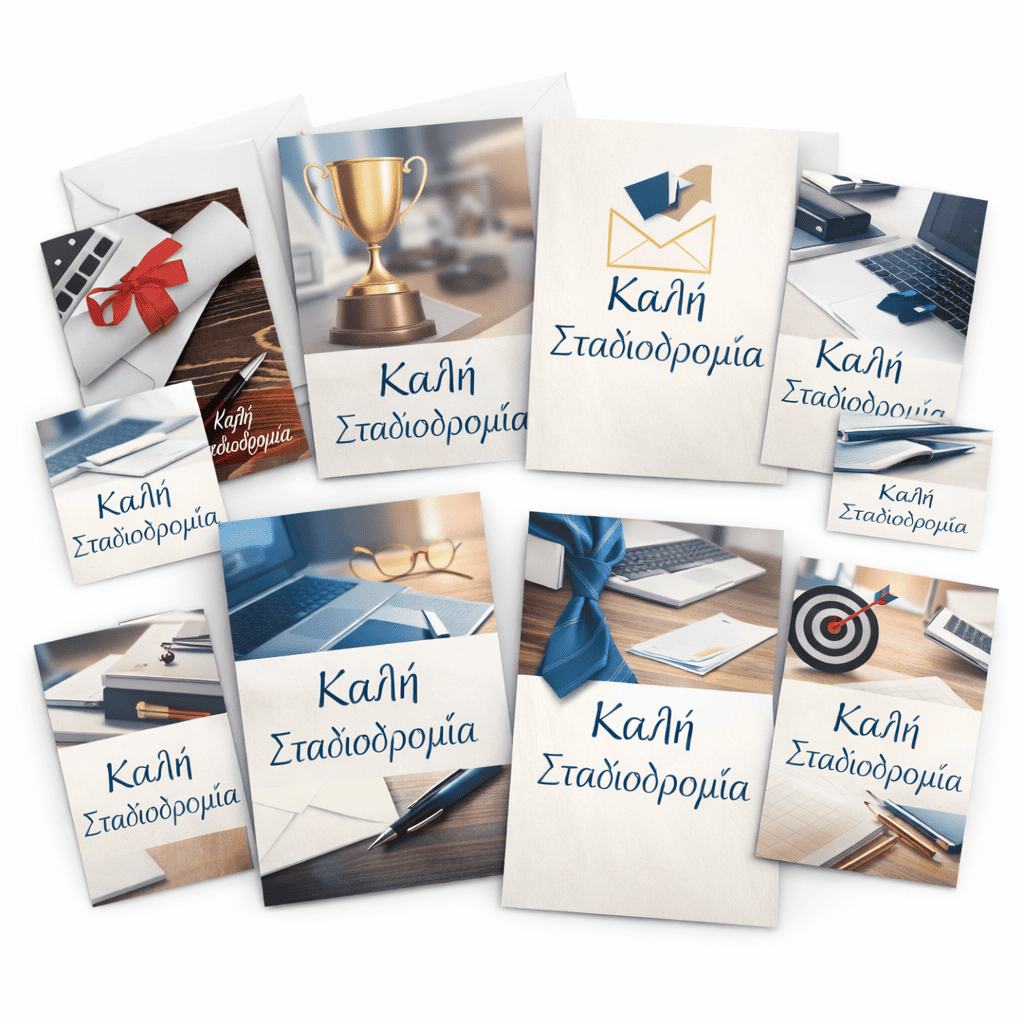 Κομψές και σύγχρονες ευχετήριες κάρτες με μήνυμα «Καλή Σταδιοδρομία», ιδανικές για αποφοίτηση, νέα δουλειά, προαγωγή ή κάθε νέο επαγγελματικό ξεκίνημα.