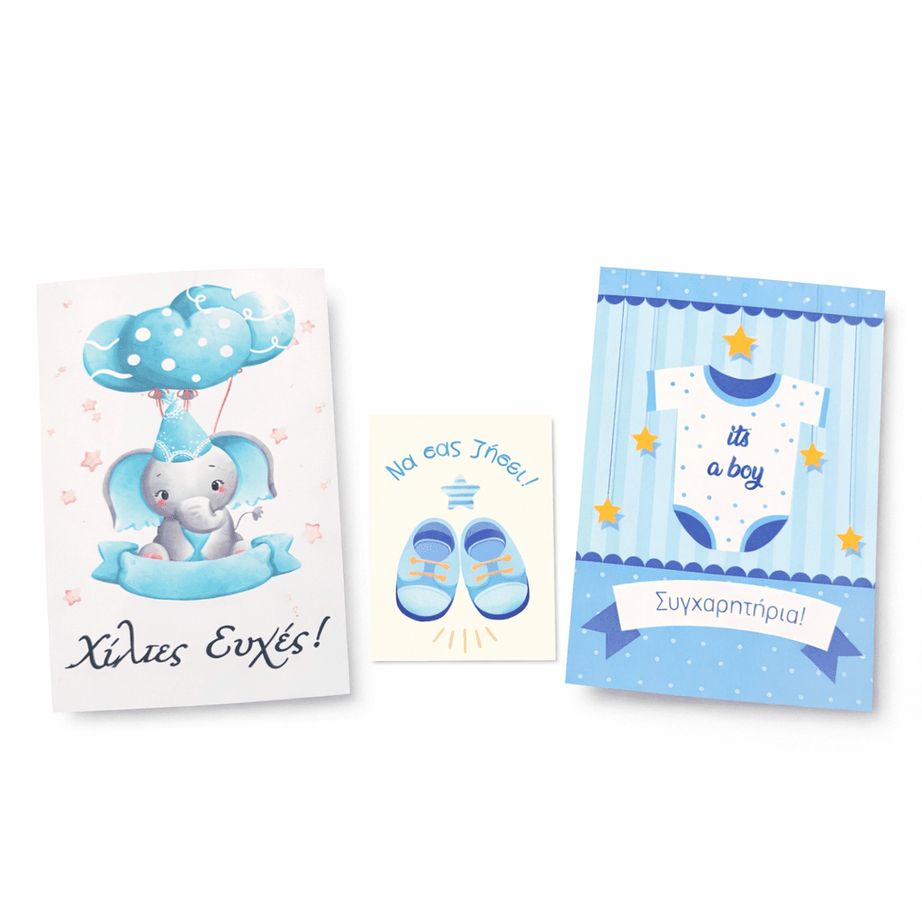 Γλυκιά ευχετήρια κάρτα για τον ερχομό ενός μικρού αγοριού. Κάθε κάρτα διαθέτει διαφορετικό τρυφερό σχέδιο με βρεφικά στοιχεία όπως ζωάκια, παπουτσάκια, ρουχαλάκια ή απαλά γαλάζια μοτίβα.