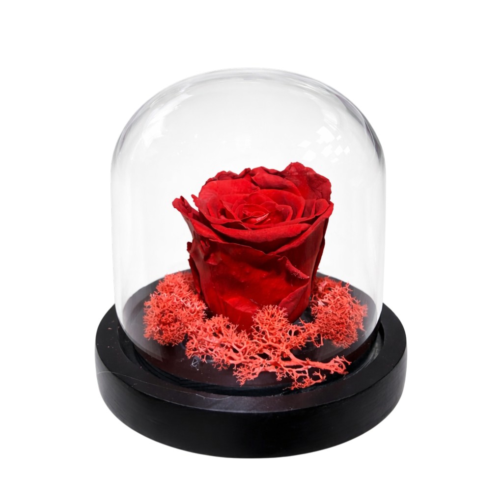 Κομψή διακοσμητική σύνθεση με αληθινό ζυμωμένο τριαντάφυλλο, τοποθετημένο σε μαύρη βάση και προστατευμένο από διάφανο γυάλινο καπάκι υψηλής διαύγειας. Το φυσικό τριαντάφυλλο έχει υποστεί ειδική επεξεργασία συντήρησης ώστε να διατηρεί το έντονο χρώμα και τη φρέσκια εμφάνισή του για μεγάλο χρονικό διάστημα χωρίς νερό ή φροντίδα. Ιδανικό ως δώρο αγάπης, επετειακό δώρο ή κομψό διακοσμητικό για σπίτι και επαγγελματικούς χώρους, προσθέτοντας μια ρομαντική και πολυτελή αισθητική σε κάθε περιβάλλον.