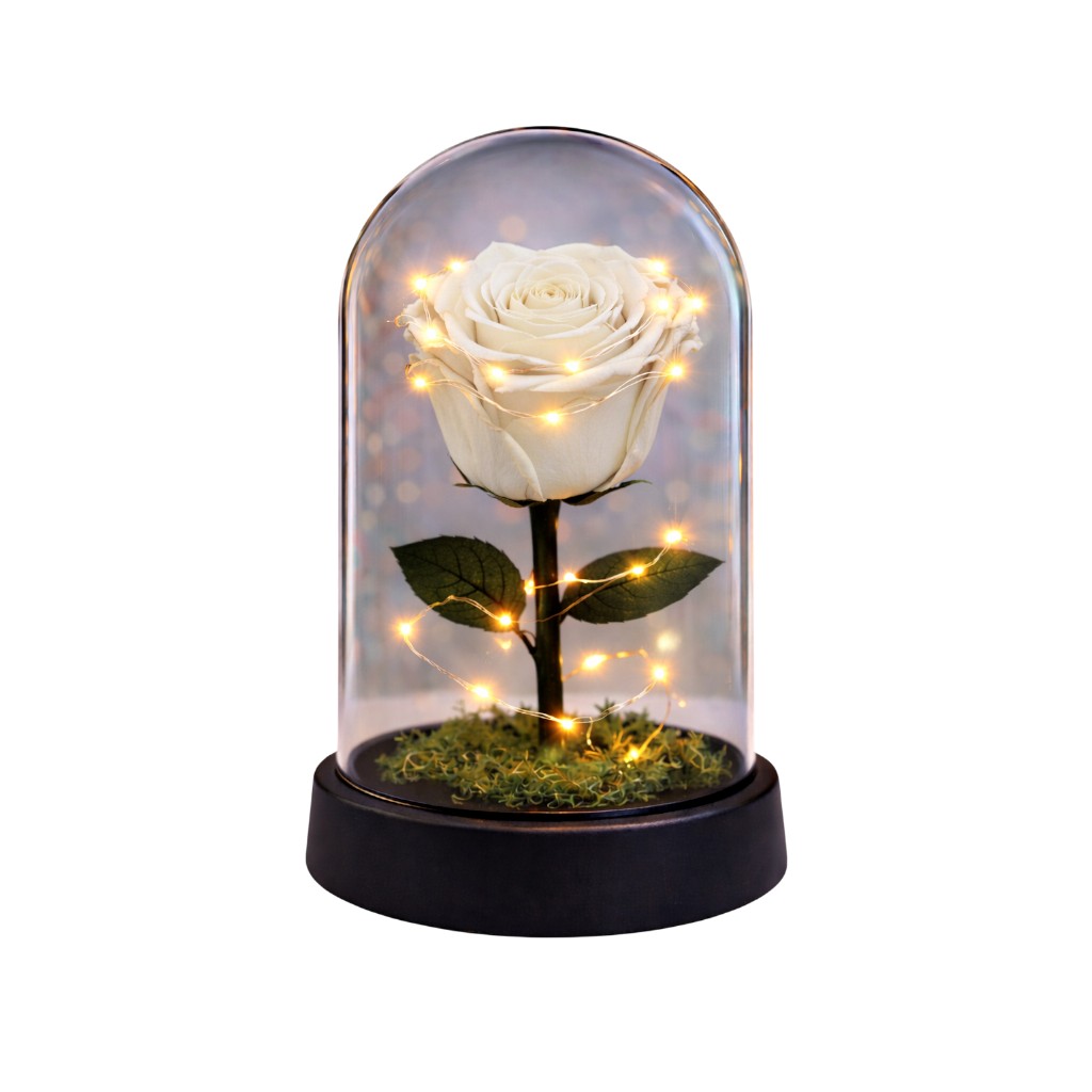 Χαρακτηριστικά: Διαστάσεις γυάλας Ύψος 21εκ. Διάμετρος 14εκ. Περιγραφή : Αληθινό αποχυμωμένο τριαντάφυλλο σε λευκό χρώμα με διάρκεια ζωής από 3 έως 5 χρόνια. Οδηγίες συντήρησης : Να είναι σε ένα φωτεινό σημείο μέσα στον χώρο, αλλά να μην το χτυπάει απευθείας ο ήλιος. ΔΕ ΧΡΕΙΑΖΕΤΑΙ πότισμα καθώς είναι ειδικά επεξεργασμένο να διαρκεί χρόνια