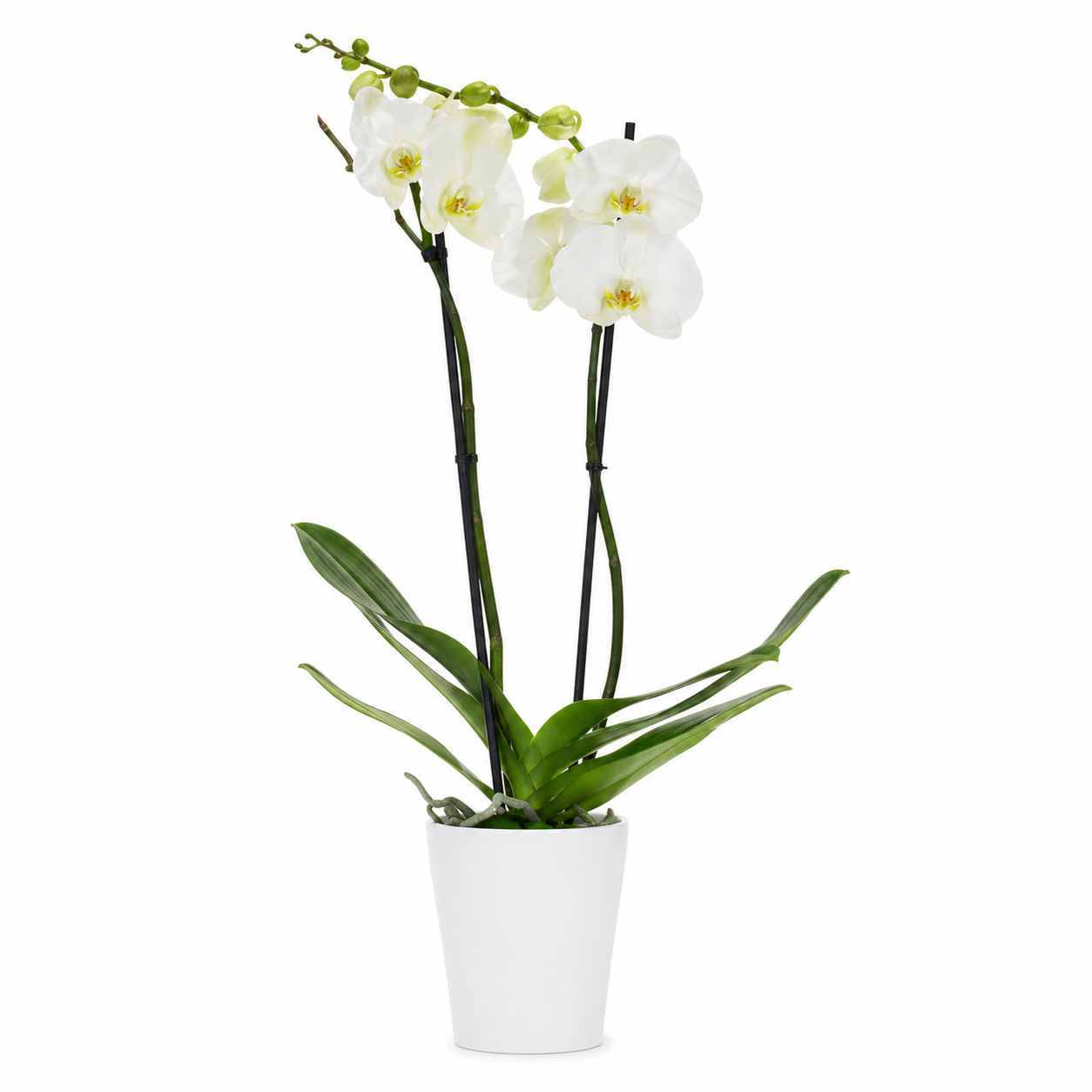 Oρχιδέα Phalenopsis με δύο κλαδιά μαζί με λευκό κεραμικό κασπώ, με το αντίστοιχο χρώμα. Ένα φυτό που συμβολίζει την πολυτέλεια, την ομορφιά και την ελπίδα. Ο αριθμός των λουλουδιών της ορχιδέας ενδέχεται να διαφέρει από αυτή της φωτογραφίας καθώς πρόκειται για φρέσκο και ζωντανό προϊόν που παραλαμβάνουμε κάθε εβδομάδα.