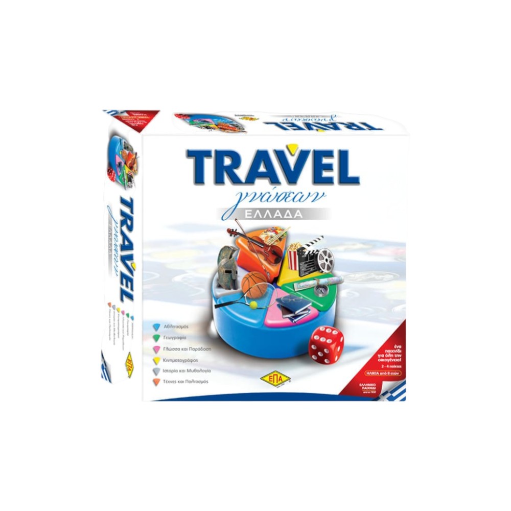 Το πιο συναρπαστικό ταξίδι… χωρίς να φύγεις από το σπίτι! Ανακάλυψε ξανά την Ελλάδα μέσα από ένα παιχνίδι γεμάτο ερωτήσεις, ανατροπές και διασκέδαση! Ρίξε το ζάρι, προχώρα στο ταμπλό και απάντησε σε έξυπνες ερωτήσεις που καλύπτουν έξι διαφορετικές θεματικές ενότητες: πολιτισμός & τέχνες, κινηματογράφος, ιστορία & μυθολογία, γεωγραφία, αθλητισμός και γλώσσα & παράδοση. Ιδανικό για παιδιά από 8 ετών, αλλά και για μεγάλους που αγαπούν τα παιχνίδια γνώσεων, το Travel Γνώσεων – Ελλάδα μετατρέπει κάθε παρτίδα σε μικρή εκπαιδευτική περιπέτεια. Για 2 έως 4 παίκτες ή ομάδες παικτών με ΑΥΘΕΝΤΙΚΑ ΠΙΟΝΙΑ TRAVEL. Μάθε, γέλασε, ταξίδεψε… και γίνε ο απόλυτος γνώστης της Ελλάδας! Παράγεται 100% στην Ελλάδα.